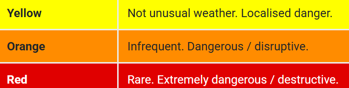 Met Éireann uses a colour-coded warning system based on the severity or intensity of severe weather: